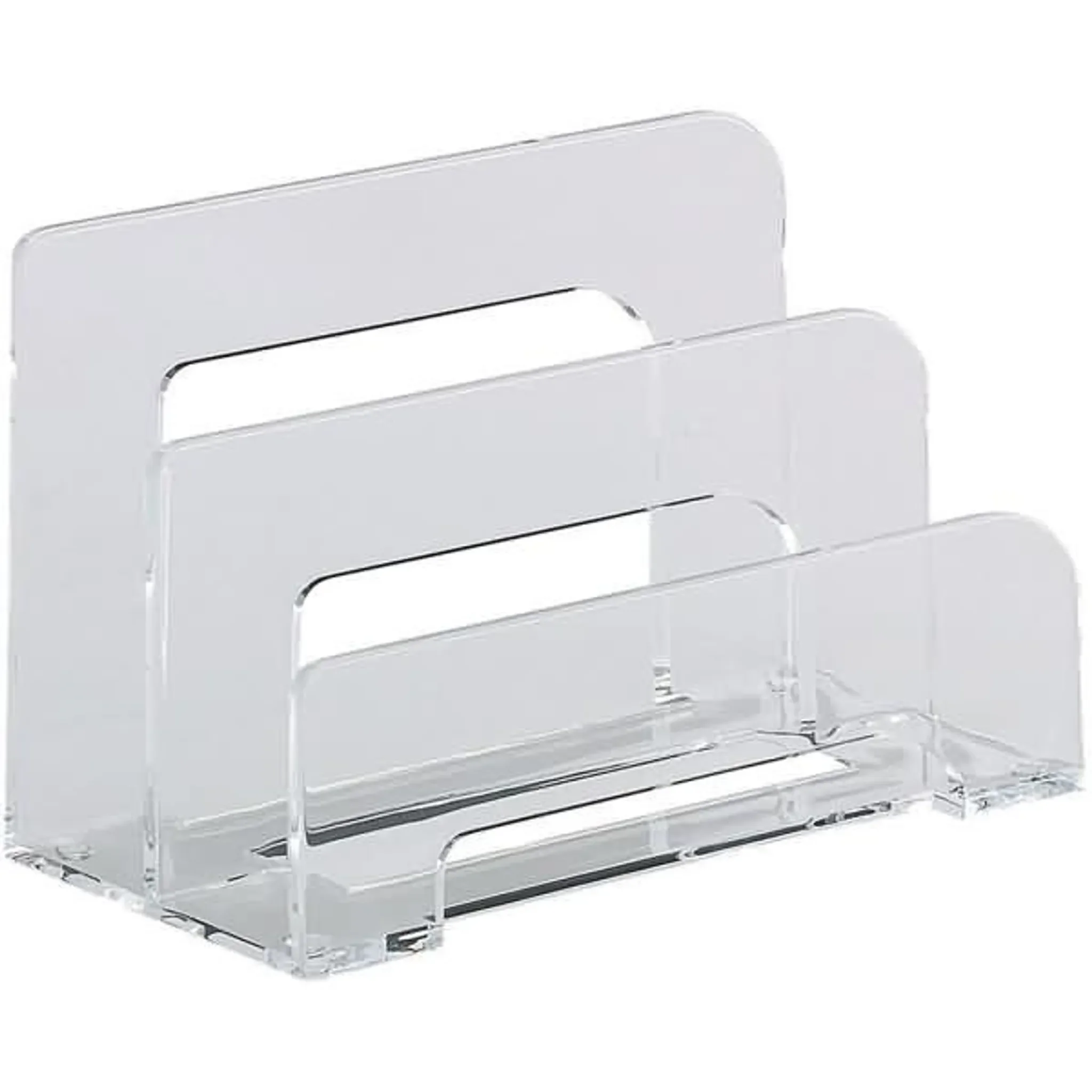 Stilvoller Briefständer mit zwei Fächern aus glasklarem Acryl zur übersichtlichen Aufbewahrung von Briefen, Formularen, Notizzetteln oder sonstigen Schriftstücken. Die abgerundeten Kanten verleihen eine moderne, weiche Optik und sorgen für angenehme Haptik im täglichen Gebrauch.