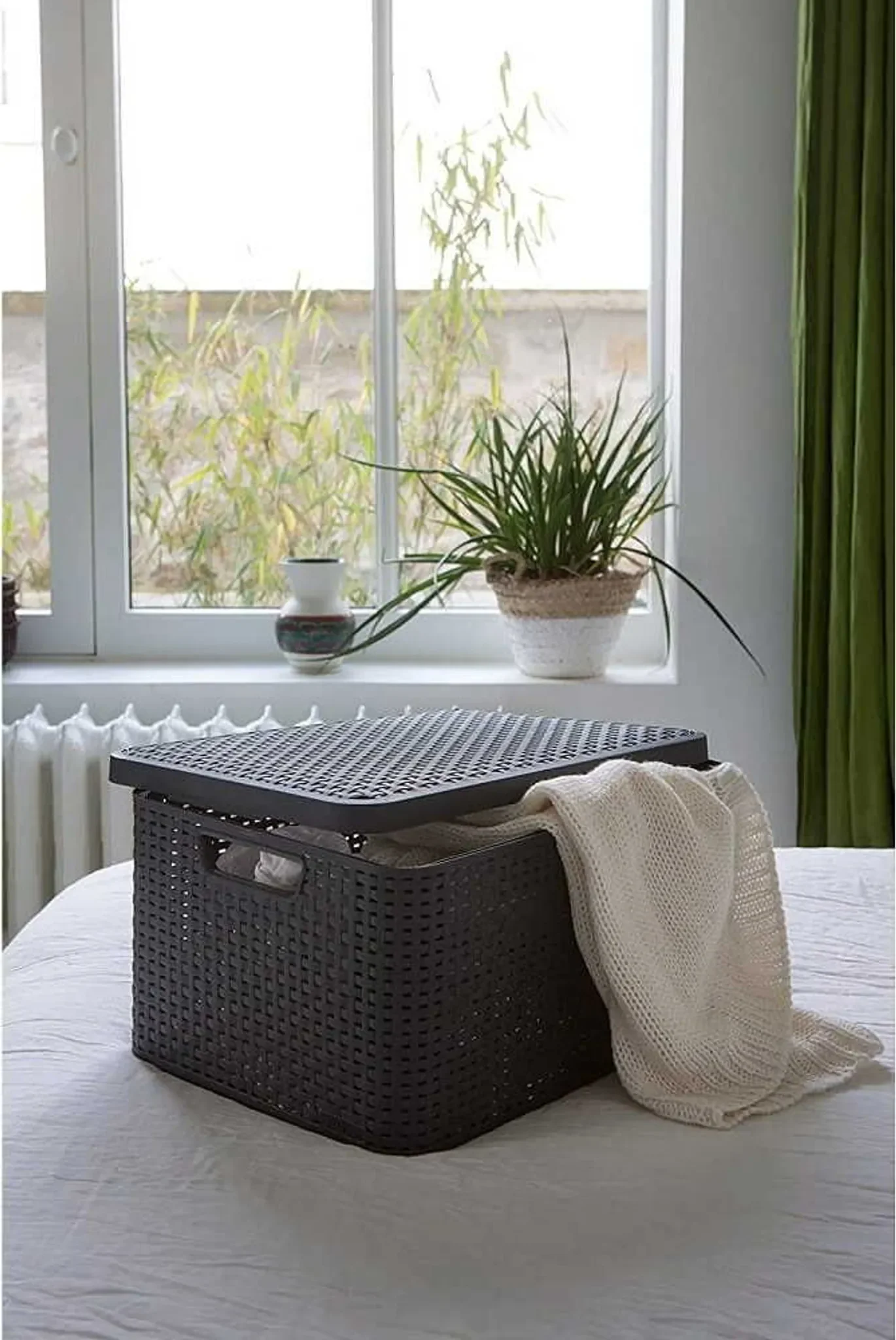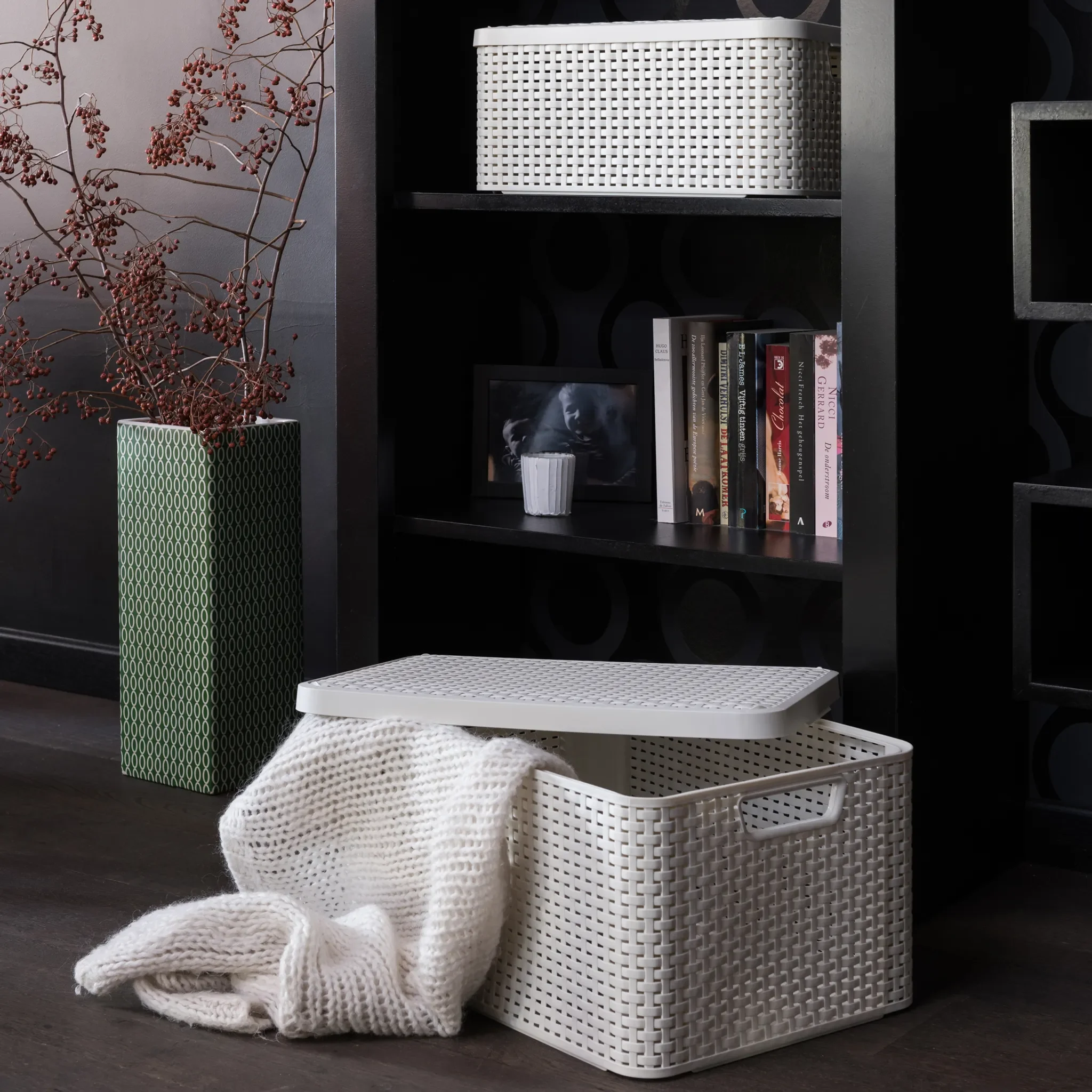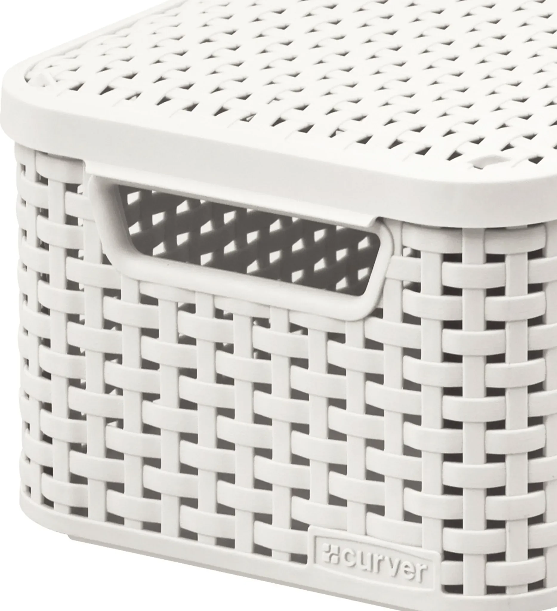 Das geflochtene Design in Rattan-Optik verleiht der Box ein stilvolles Aussehen, das sich harmonisch in jede Einrichtung einfügt. Hergestellt aus 70 % recyceltem Kunststoff, ist die Box robust, leicht zu reinigen und stapelbar, sodass sie auch für platzsparendes Aufbewahren geeignet ist.