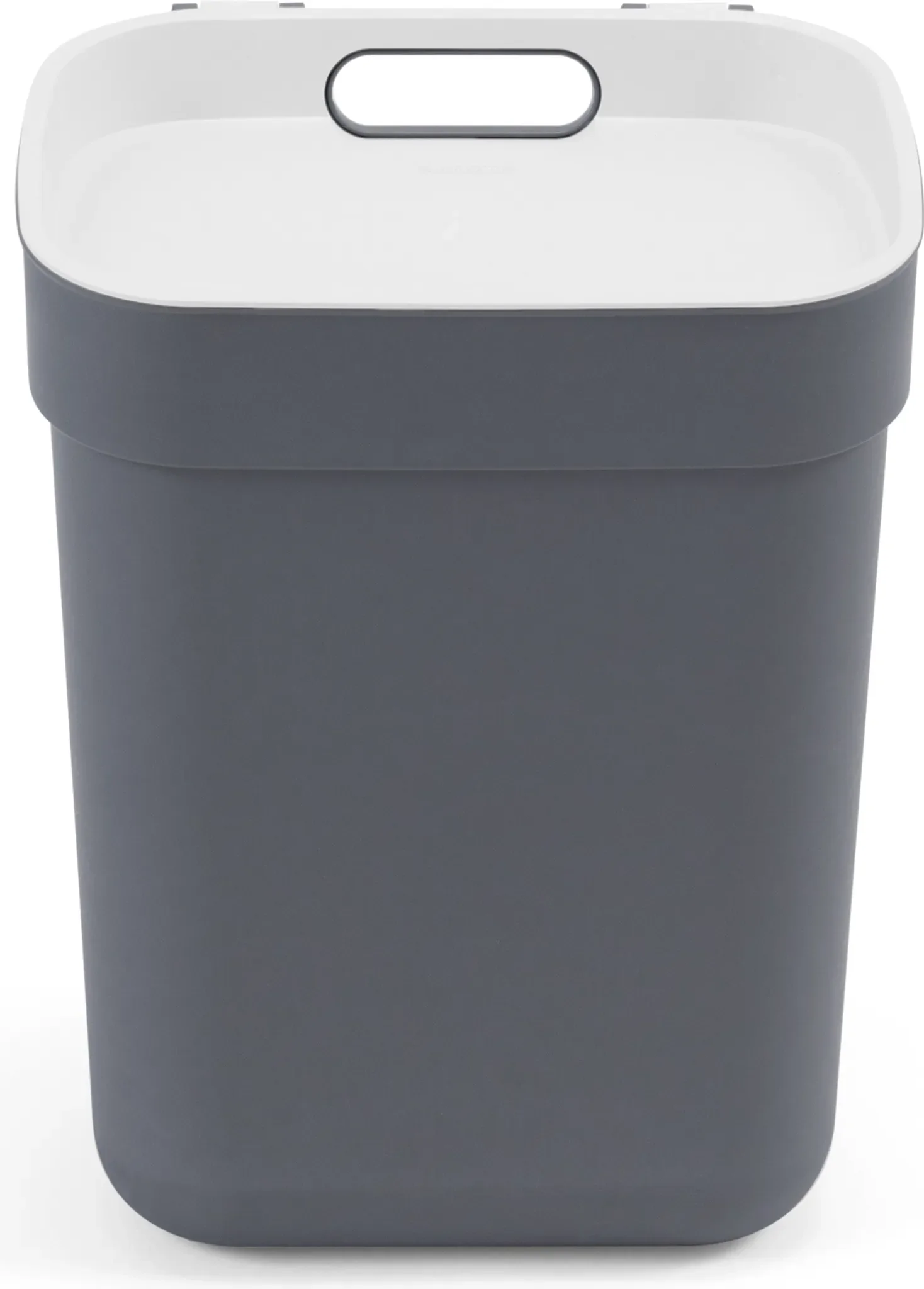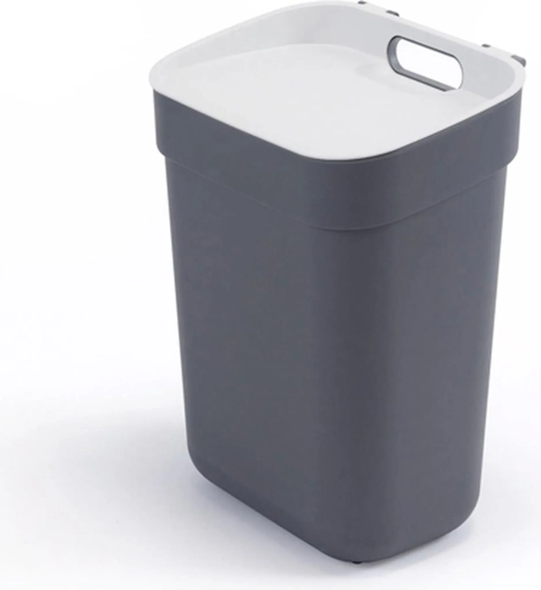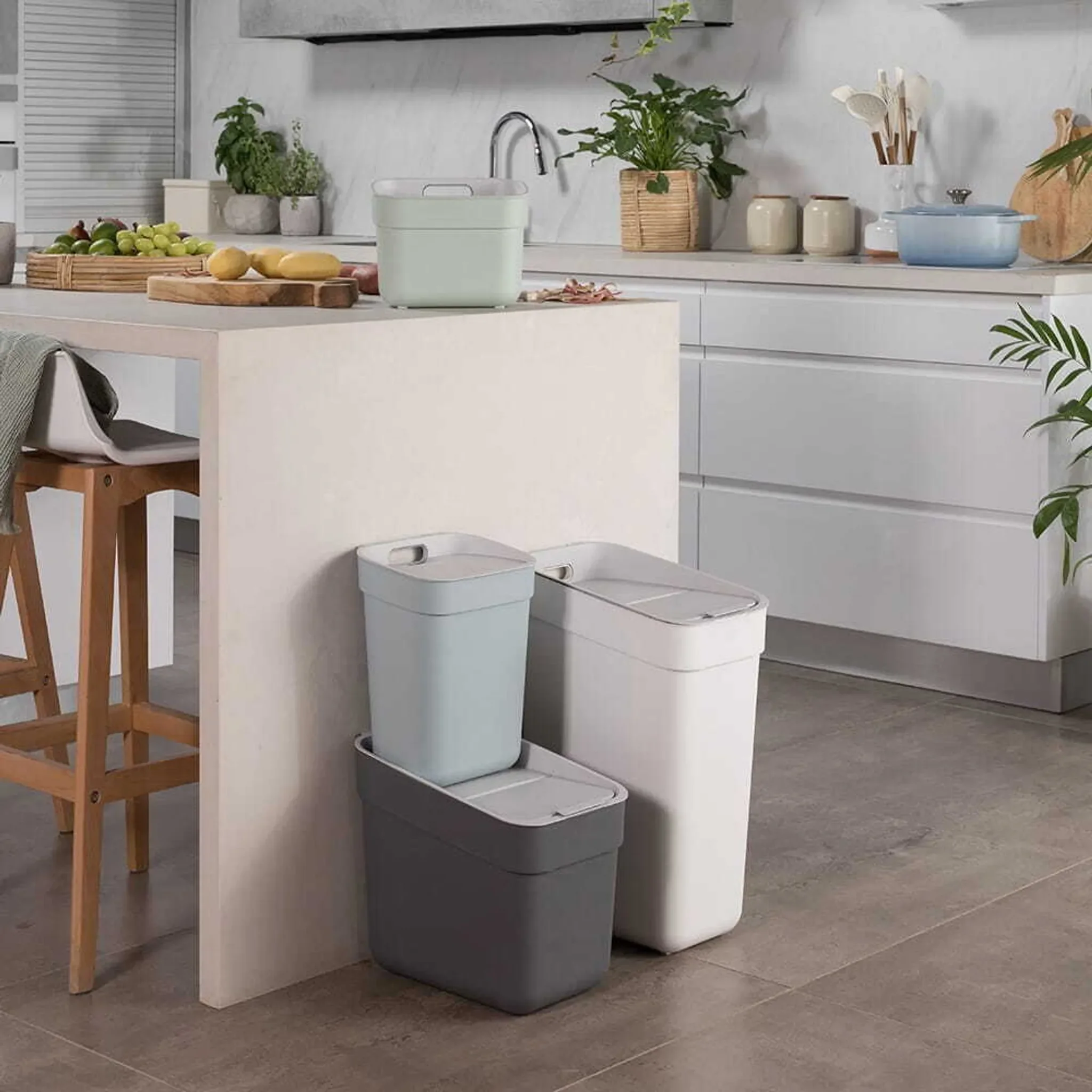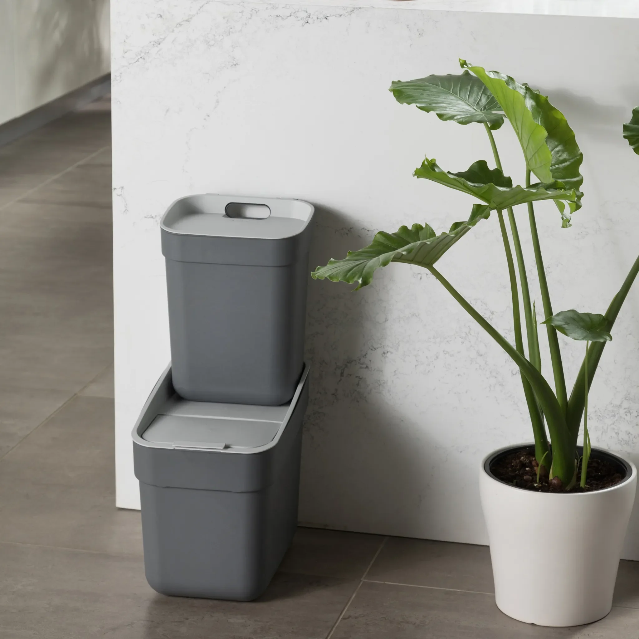 Der Mülleimer besteht zu 100 % aus recyceltem Kunststoff und lässt sich problemlos stapeln, wodurch er perfekt in modulare Abfallsysteme passt. Ein integrierter Müllbeutelhalter verhindert Verrutschen, während der luftdichte Deckel unangenehme Gerüche reduziert. Mit seinem minimalistischen Design fügt sich der Behälter harmonisch in Küchen, Haushaltsräume oder Vorratsschränke ein.
