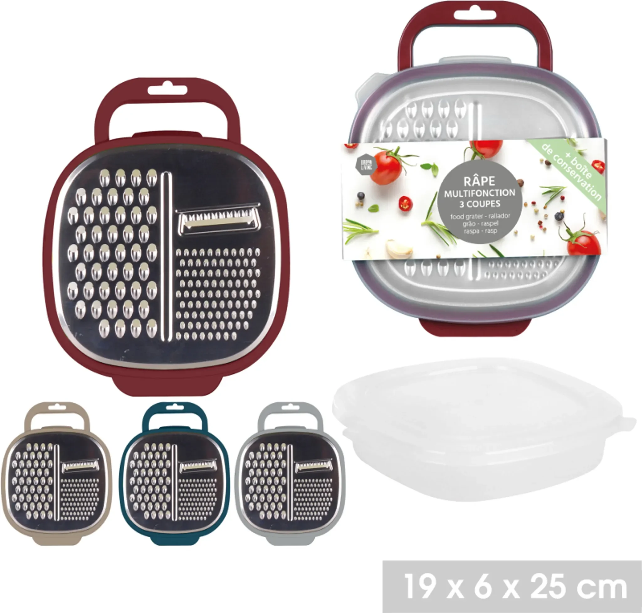 Praktische Reibe mit integriertem Behälter für sauberes und effizientes Arbeiten in der Küche. Ideal zum Reiben von Gemüse, Obst, Käse oder anderen Zutaten – die geriebenen Stücke fallen direkt in den Auffangbehälter, wodurch Spritzer und Unordnung minimiert werden.
