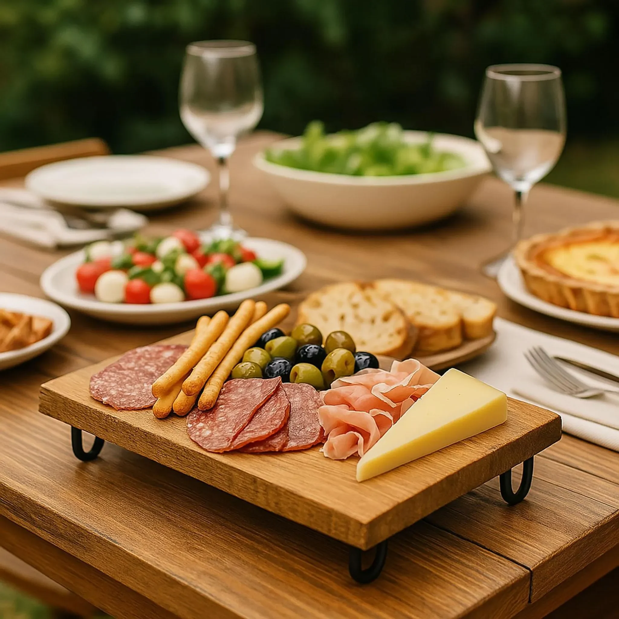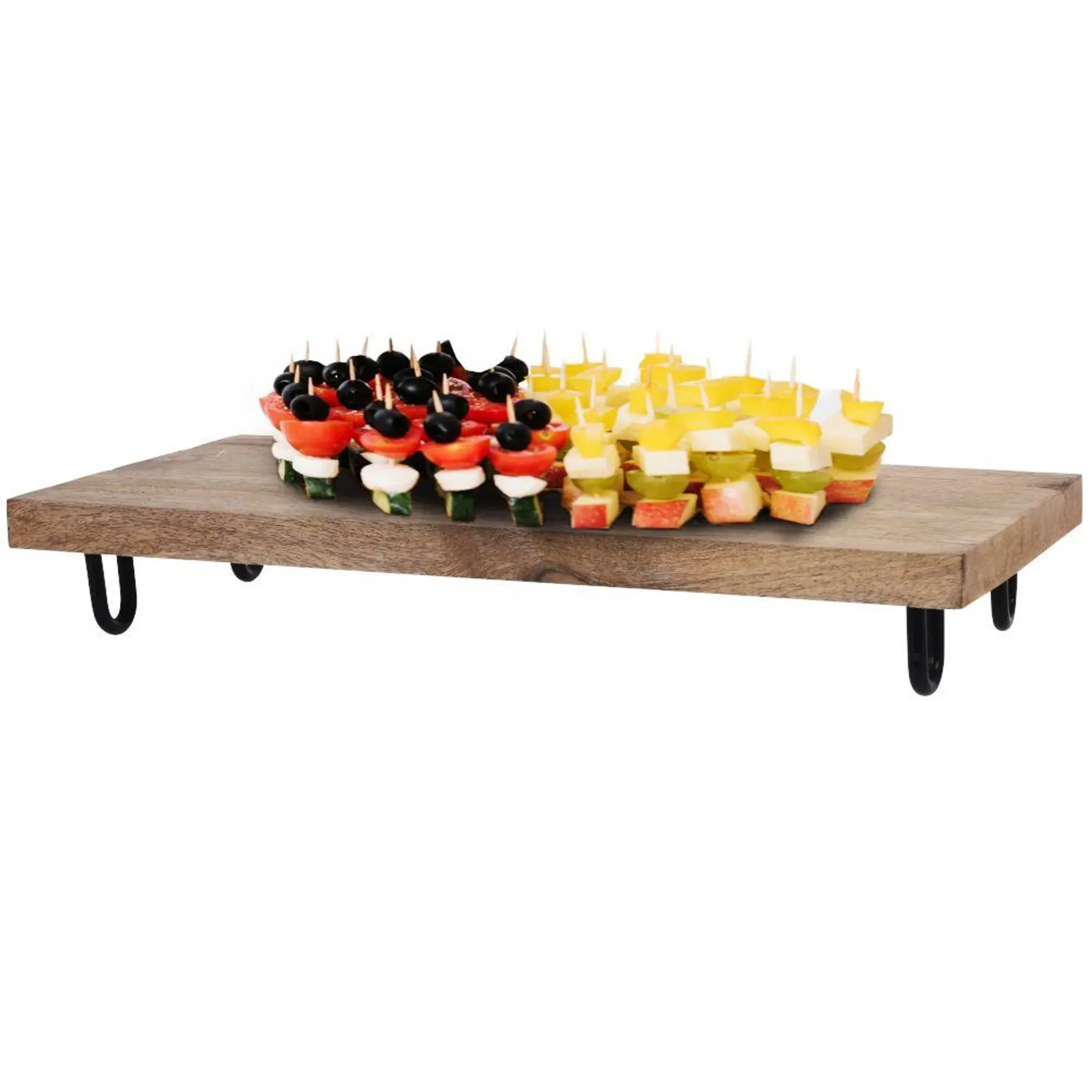 Dieses stilvolle Holztablett mit Metallbeinen ist eine elegante Lösung zum Servieren von Käse, Aufschnitt, Snacks oder Vorspeisen. Das erhöhte Design setzt Speisen wirkungsvoll in Szene und verleiht jedem Tisch einen modernen, dekorativen Akzent.