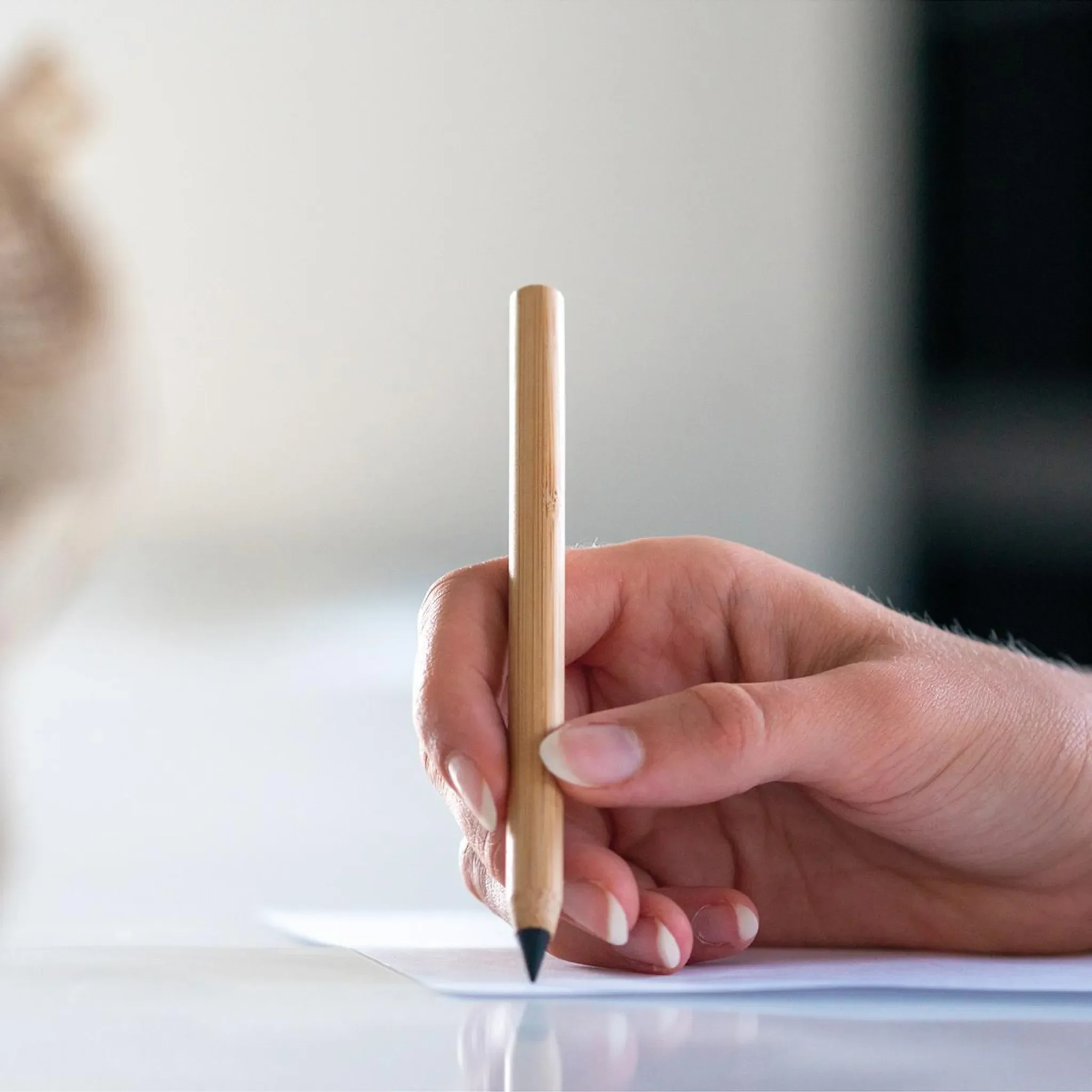 Das Endlos Schreibgerät von MACMA ist aus hochwertigem Bambus gefertigt und vereint Nachhaltigkeit mit elegantem Design. Die legierte Mine schreibt ohne Tinte und erzeugt ein dauerhaftes, graues Schriftbild auf dem Papier, das nicht radierbar ist.