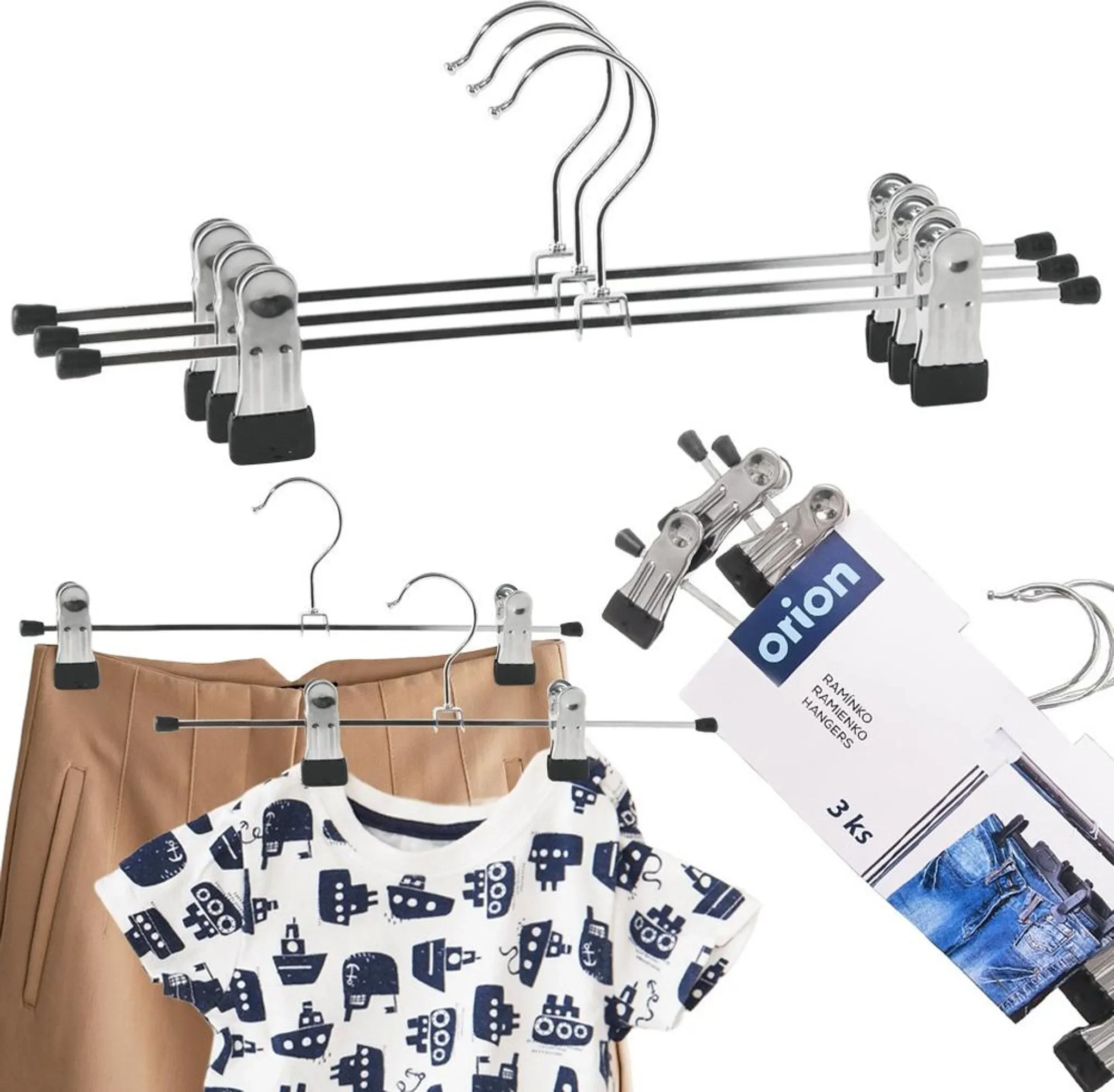 Dieses 3-teilige Kleiderbügel-Set von Orion eignet sich ideal zur Aufbewahrung von Hosen, Röcken, Shorts oder anderen Kleidungsstücken. Die beweglichen Clips ermöglichen eine flexible Breitenanpassung, sodass auch unterschiedliche Größen, Kinderkleidung oder Accessoires sicher befestigt werden können.